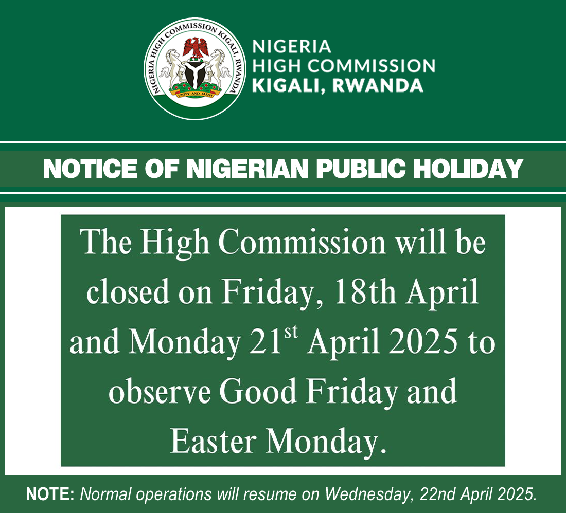 For further inquiries, the High Commission can be reached through the following phone numbers: +250 252 619 282; +250 252 567 002; from Monday to Thursday (9am – 4pm) and Friday (9am – 3pm)